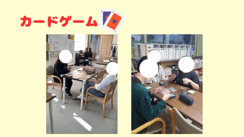 ジョブ若槻では、ワンピースカードやポケモンカードなどのカードゲームを楽しむお子さんが多く見られます。デッキを作る中で、「どのキャラクターを入れたら強くなるのか」相談し合ったり、相手と対戦する中でカードをよく理解しているお子さんにアドバイスを求めたり…ゲームの中で相手と言葉でのやり取りを上手に行うことが出来ているように思います。「自分の言葉で伝える」「相手の意見を聞く」どちらも、人との関わりの中で大切なことですね。