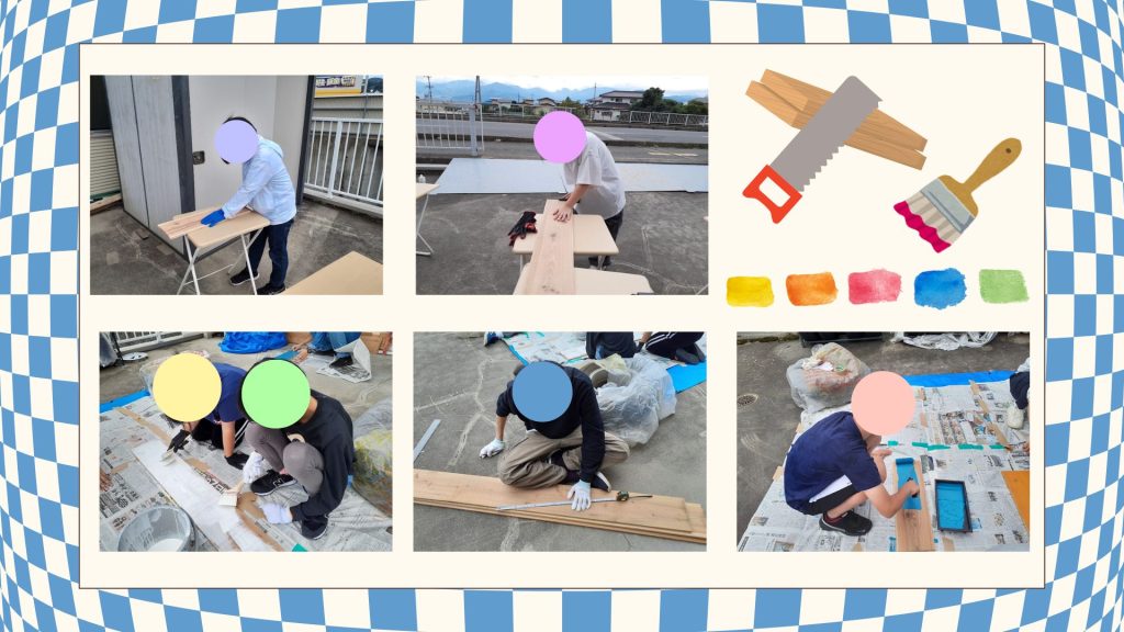 子どもたちは「木材のサイズを測る人」「のこぎりで木を切る人」「ペンキで色塗りをする人」「やすりで木を磨く人」…何個かの分担に分かれて作業を行いました。