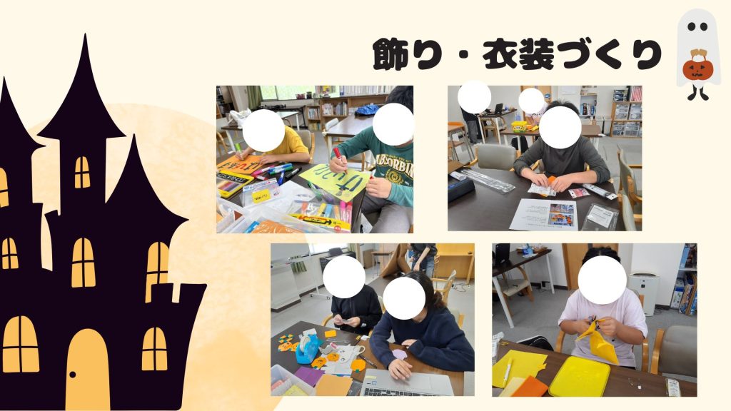 今回は、「仮装を作りたい人」と「装飾を作りたい人」の2つのグループに分かれて準備を行いました。
