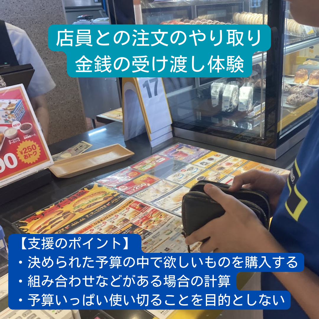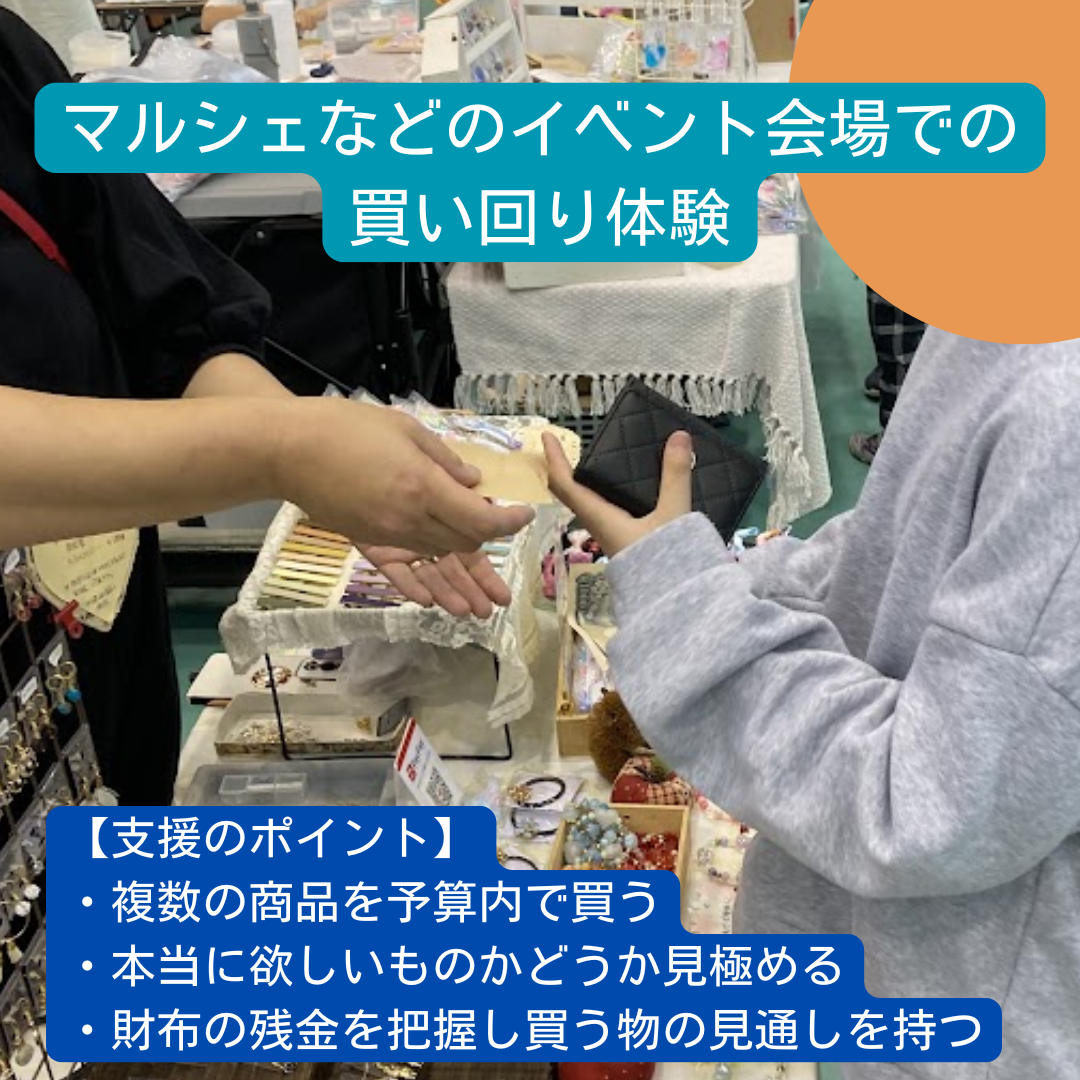場面設定をお祭りやマルシェなどのイベント会場にして、多くの誘惑の中で計画的にお金を使うことや残金がどれくらいあっていくらまで買うことができるのかなどを考えながら買い物をする、という支援をしています。