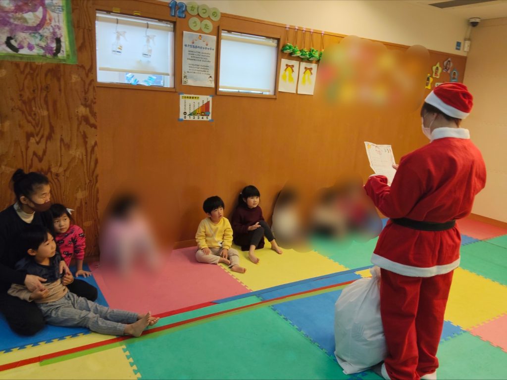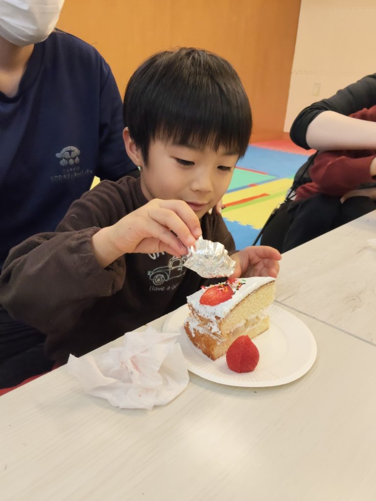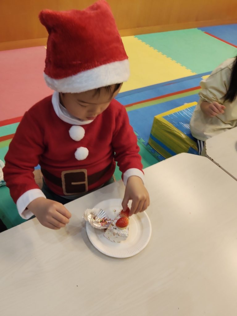 クリスマス会では、サンタクロースの登場にこども達は驚いた表情を見せながらも、 笑顔で手を振ったり近くまで行って確認したりと興味津々な様子が見られました♪ ケーキ作りでは、職員の説明を聞きながら順番を待ちクリームやフルーツのトッピング を楽しみました! 自分で選んで飾る姿や、「できた!!」「みて!」と言葉や表情で伝えようとする姿が 見られ達成感を味わう様子が印象的でした。 活動を通して、季節の行事を楽しみながらお友達や職員とのやり取り、 期待感や喜びの気持ちを共有する経験につながりました。 今年もあとわずかですが、子供たちと一緒に楽しんでいきたいと思います♪![]()