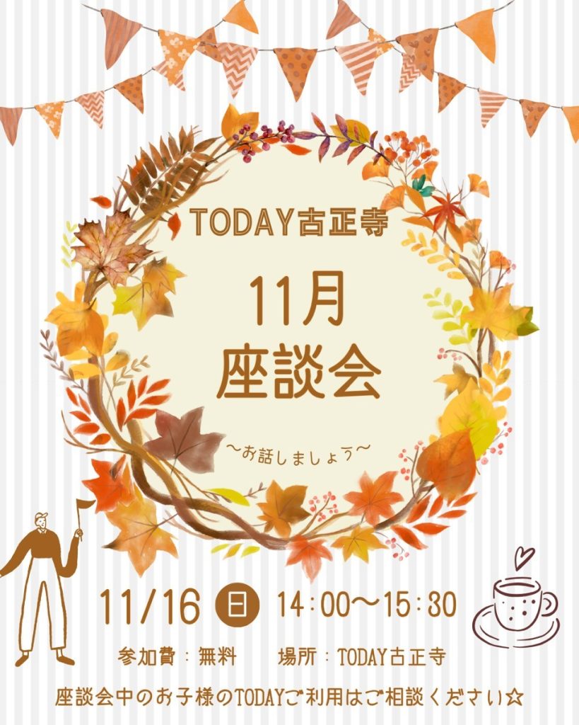 ~TODAY古正寺をご利用の皆様~ いつもTODAY古正寺をご利用いただきありがとうございます。 🍀座談会のお知らせ🍀 11/16(日)に座談会を開催します♪ ⭐就学、放デイのこと ⭐こんな時どうしていますか? ⭐家庭や仕事のこと…など ぜひ気軽にお話しましょう♬ お母様、お父様、ご両親でのご参加、大歓迎です♪ 座談会中のお子様のTODAYご利用はご相談ください!!! ご参加心よりお待ちしております。